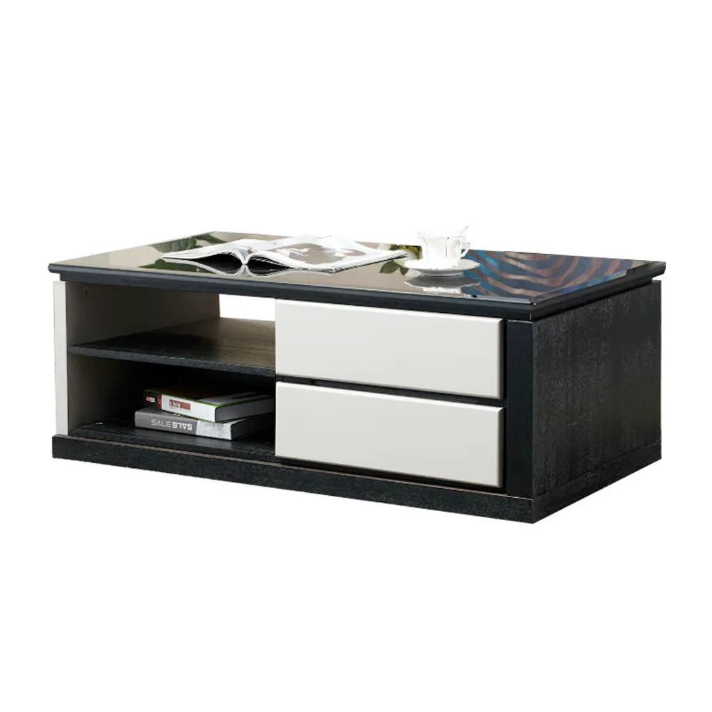 Two drawers and a lower shelf make it easy to store remotes,. Back of coffee table is also mirrored. Comes fully assembled except for handles. Comes with 2 drawers for storage with a bronze gold trimming. Square glass coffee table with storage drawer: